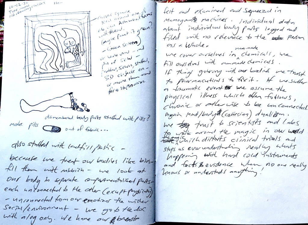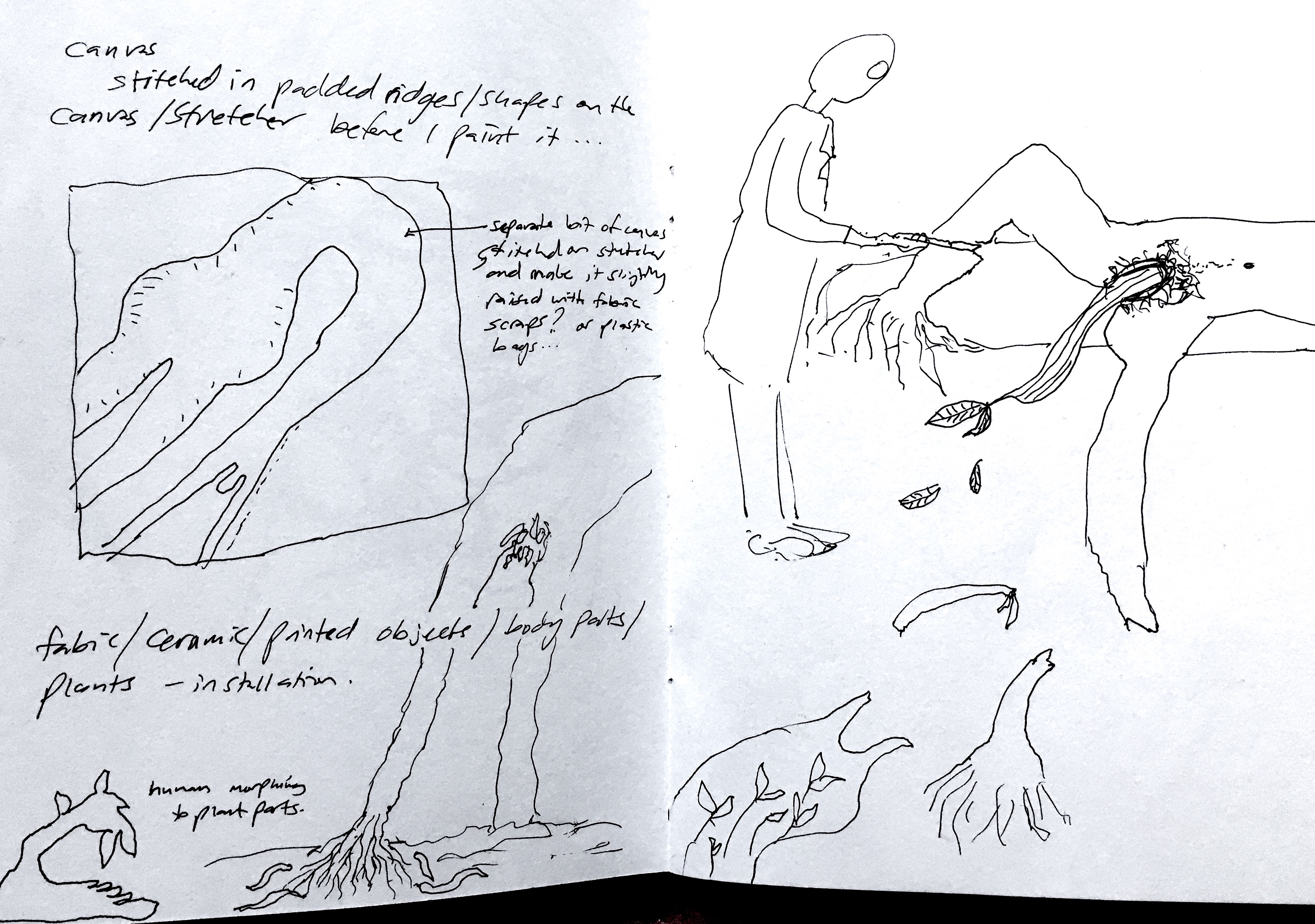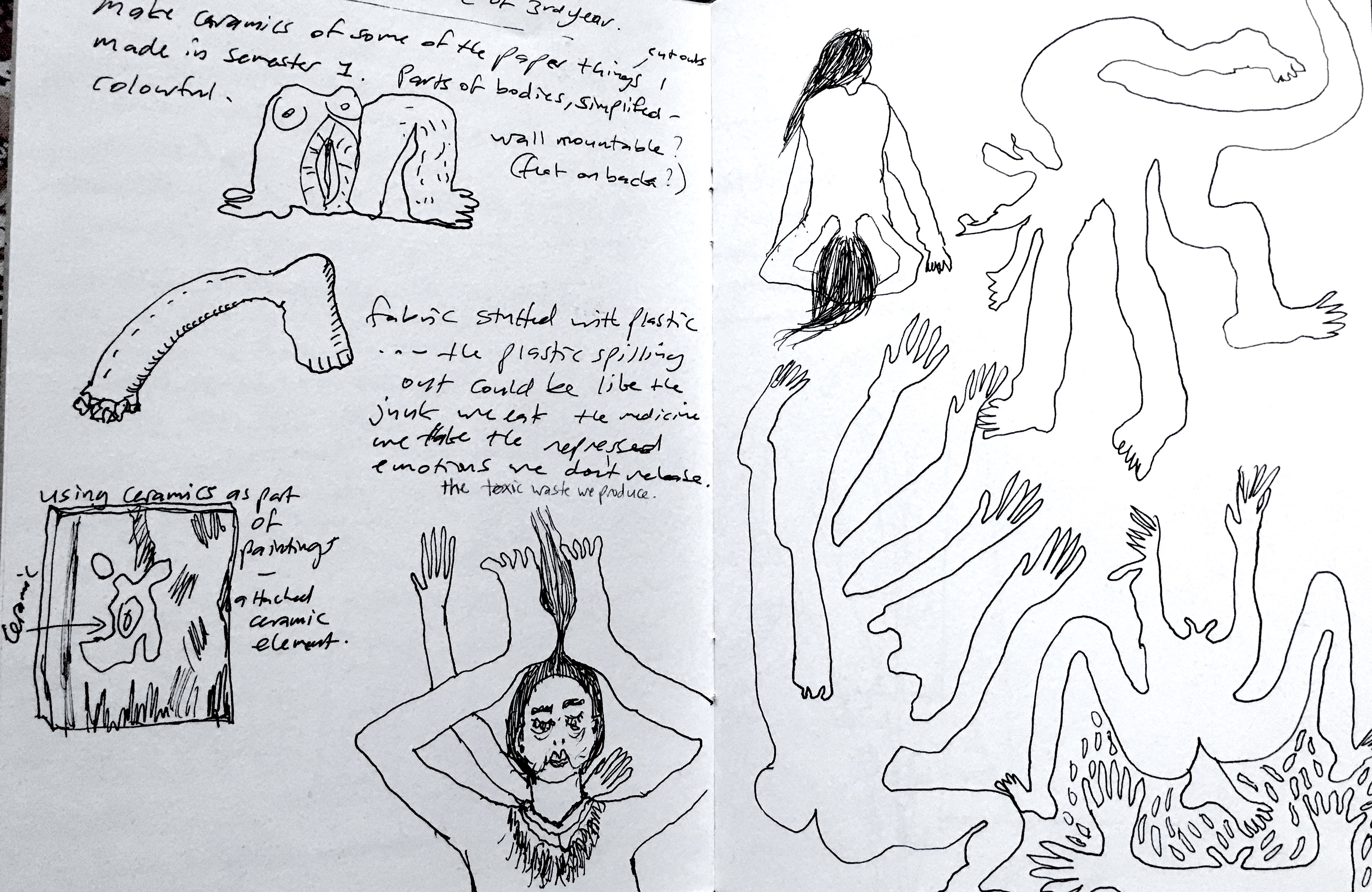 The characters and objects I am making are from an old pillowcase and are painted with acrylic inks and then sewn and stuffed with plastic rubbish. They are mutated female forms, with extra or missing limbs and body parts and also fragmented pieces of bodies.