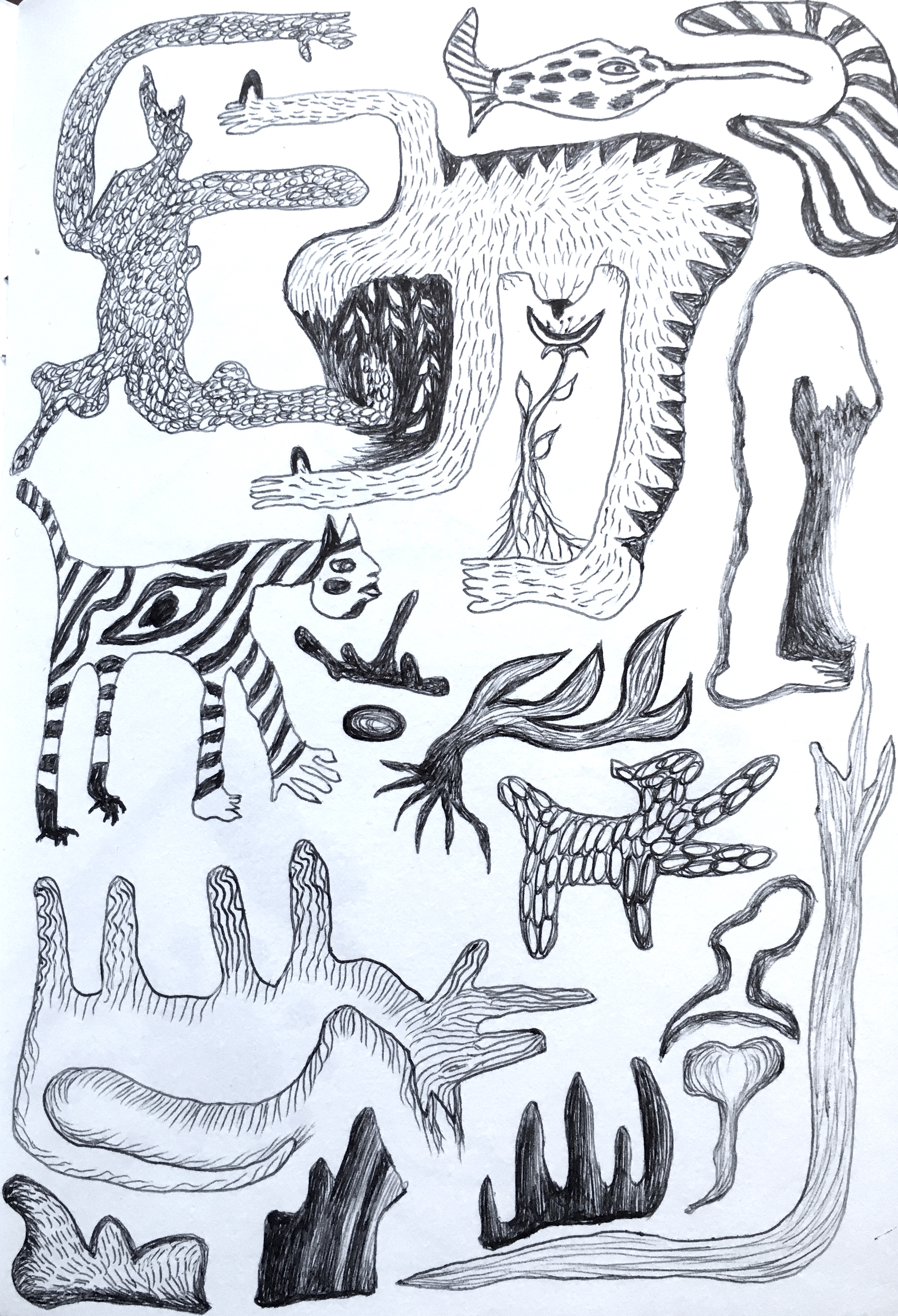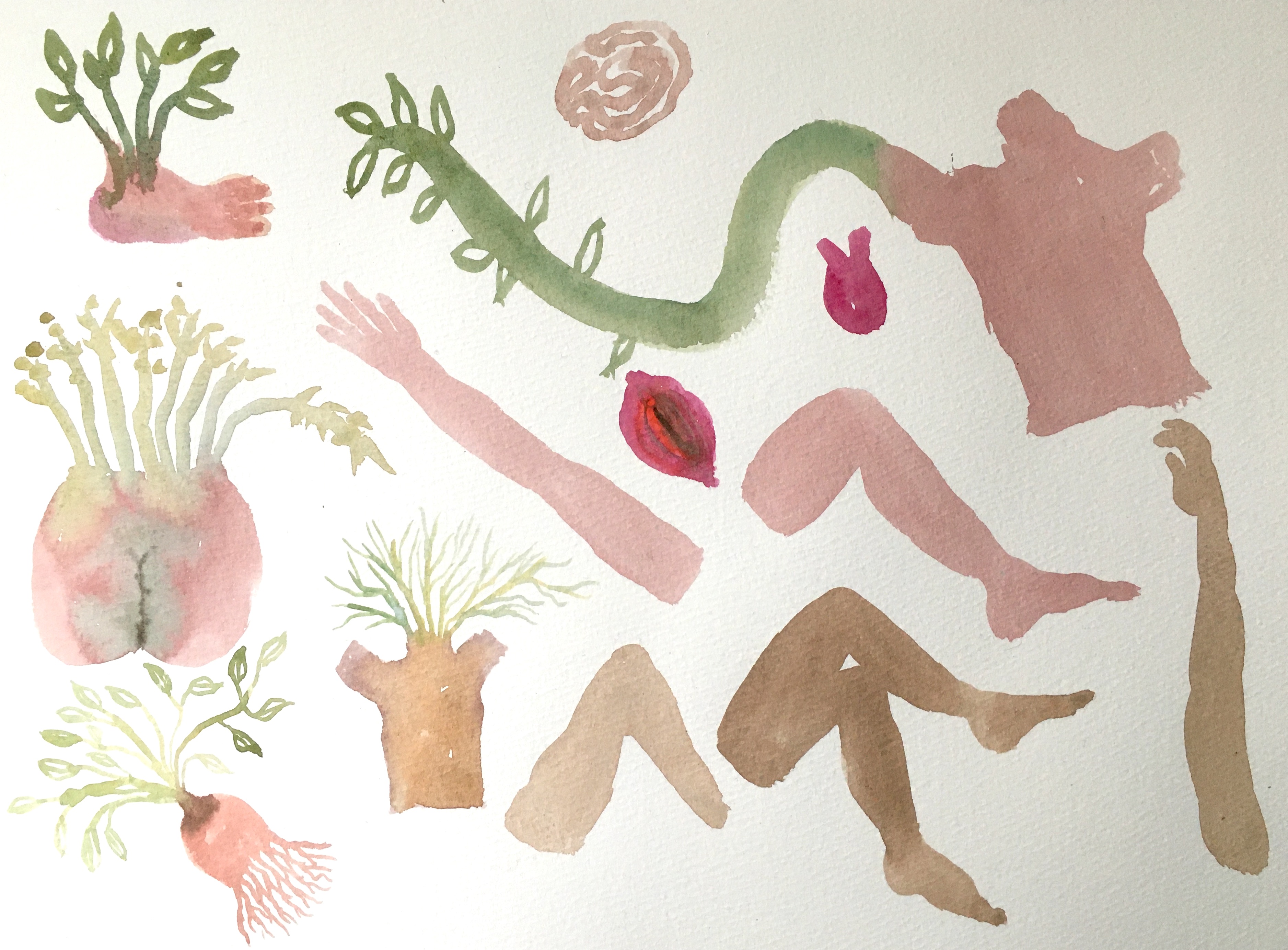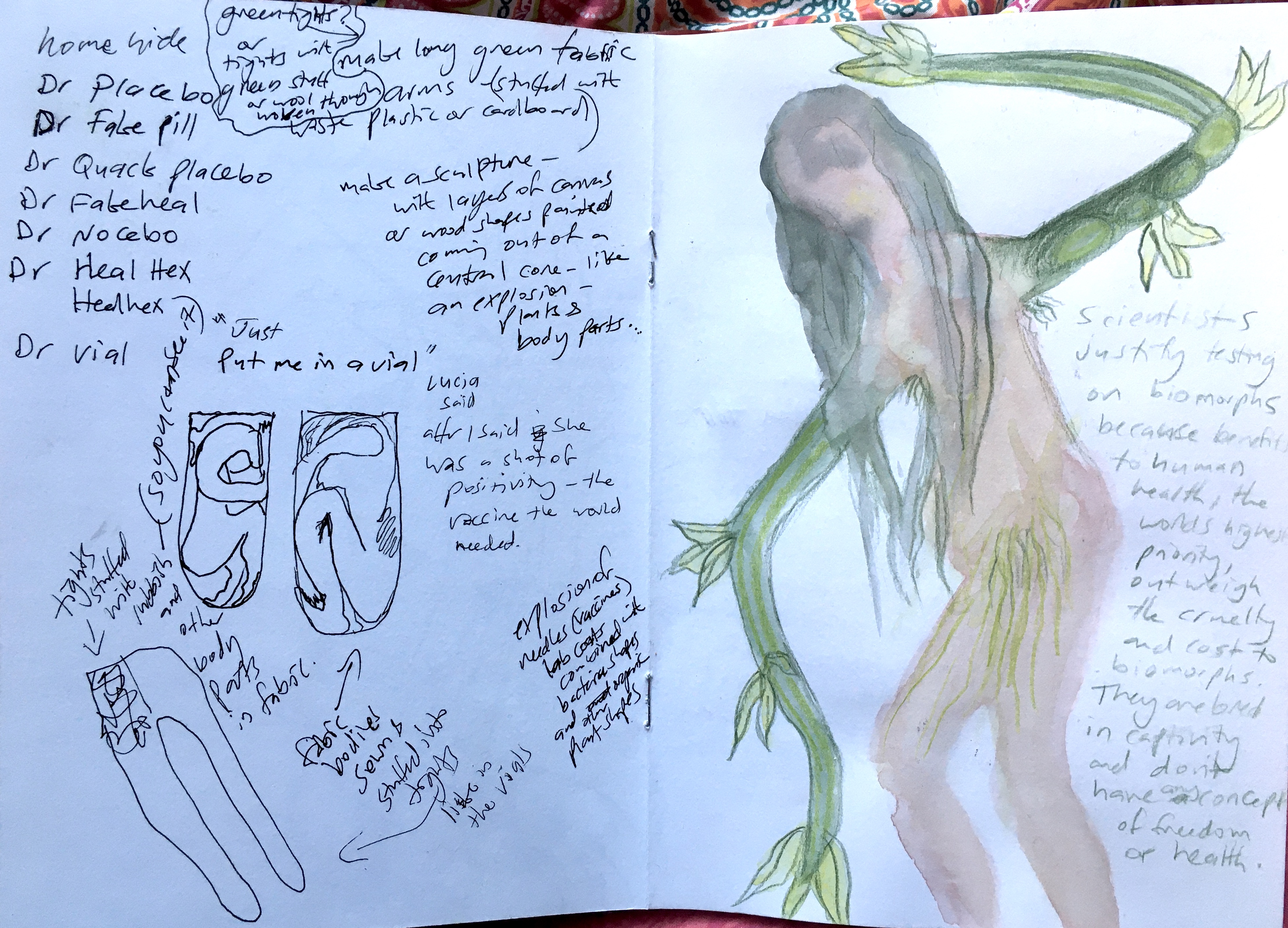 The characters and objects I am making are from an old pillowcase and are painted with acrylic inks and then sewn and stuffed with plastic rubbish. They are mutated female forms, with extra or missing limbs and body parts and also fragmented pieces of bodies.