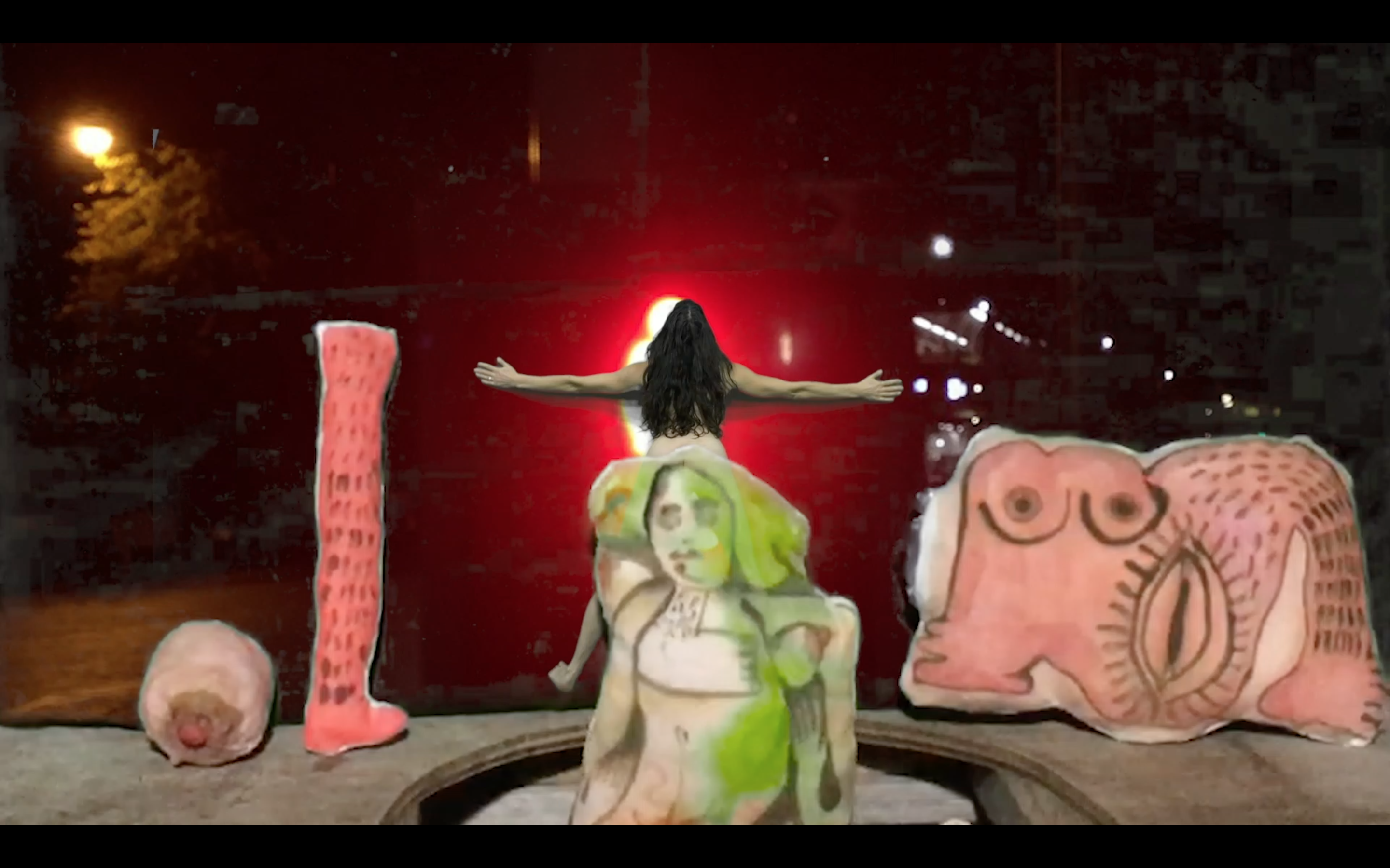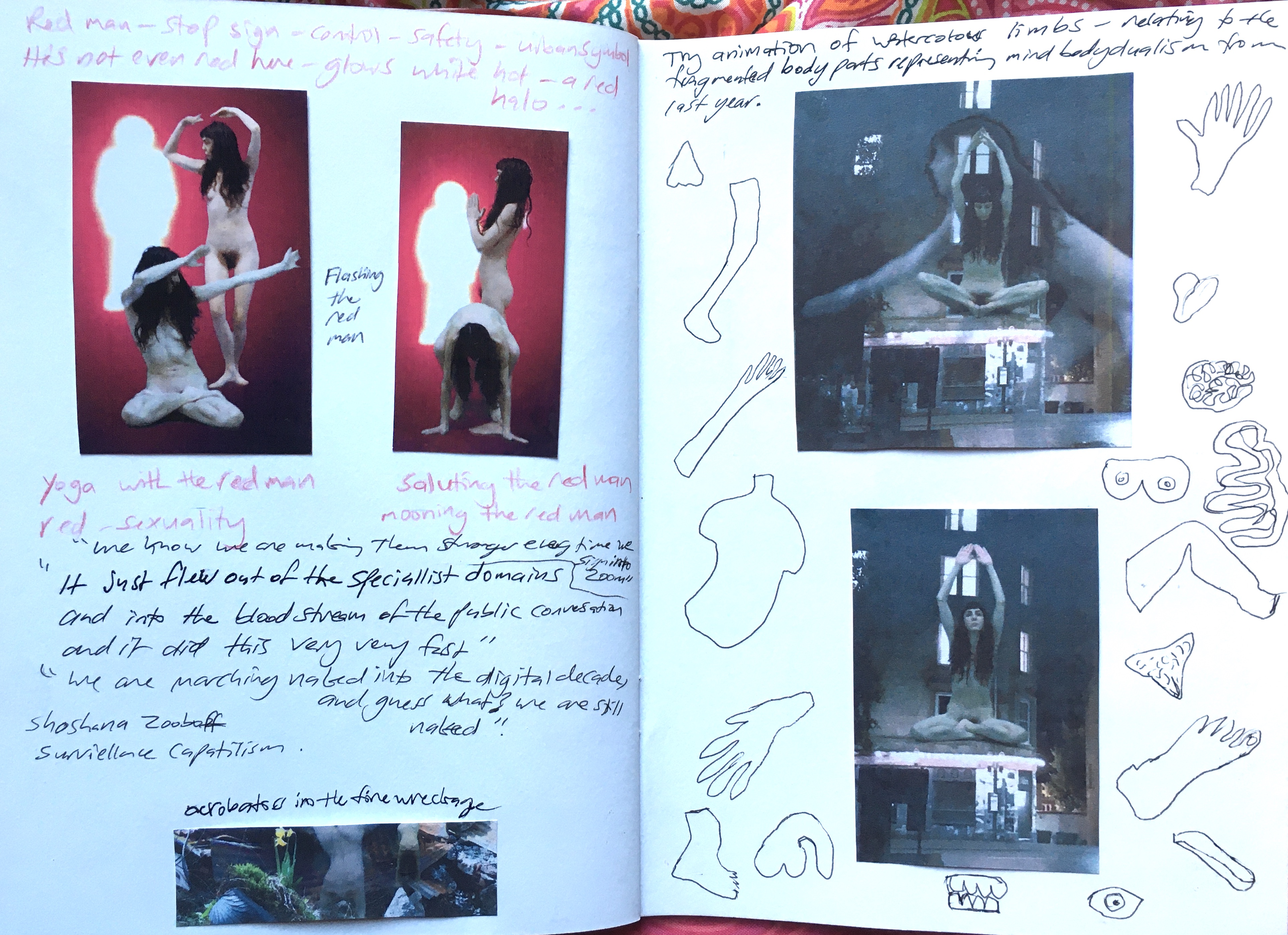 By the start of term, the 18th January, I was feeling more positive and ideas had started to flow and I was making use of what materials I had around me to start making characters to make into a sort of puppet show. I had also tried out a couple of video experiments, using yet unused green screen footage from last term of me doing naked yoga and placed me in different settings of found footage and photos on my phone. One in a meadow of wild flowers, where I am shrunk to smaller than the plants, doing yoga among the bees and one with me saluting the red man stop sign at an urban level crossing and appearing in various other Dundee street scenes and royalty free footage of a night-time city-scape with motorway running through it. I am dancing around anomalously naked, ridiculously, like some blissed out naturist and doing slightly comic yogic positions on top of shops and on busy roads. I tried sampling bits of Shoshana Zuboffs talk on Surveillance capitalism (which I found on YouTube) and added that as the soundtrack. She talks about marching into the third decade of the digital century, still naked.