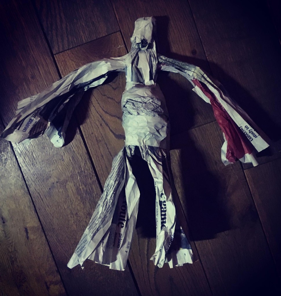 On Friday night I started making a doll/puppet out of newspaper and masking tape. She is a pregnant woman, with a womb and a newborn newspaper baby which comes in and out.