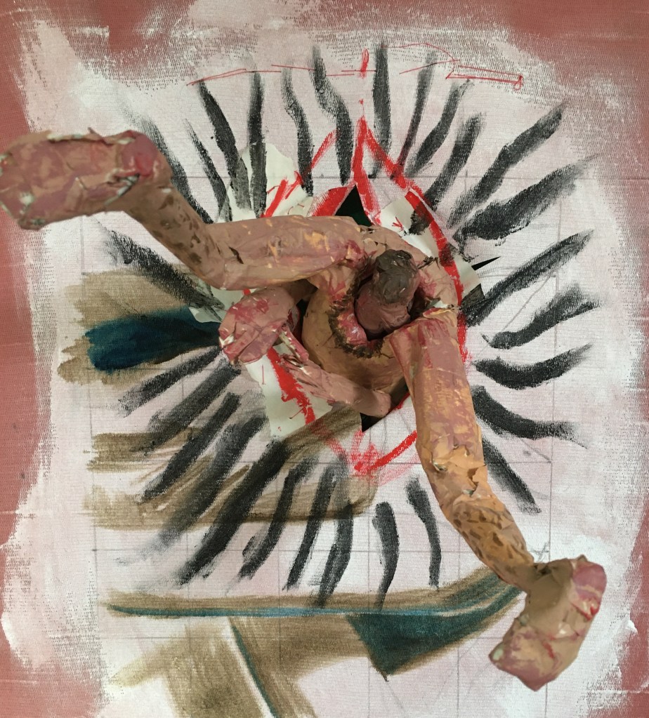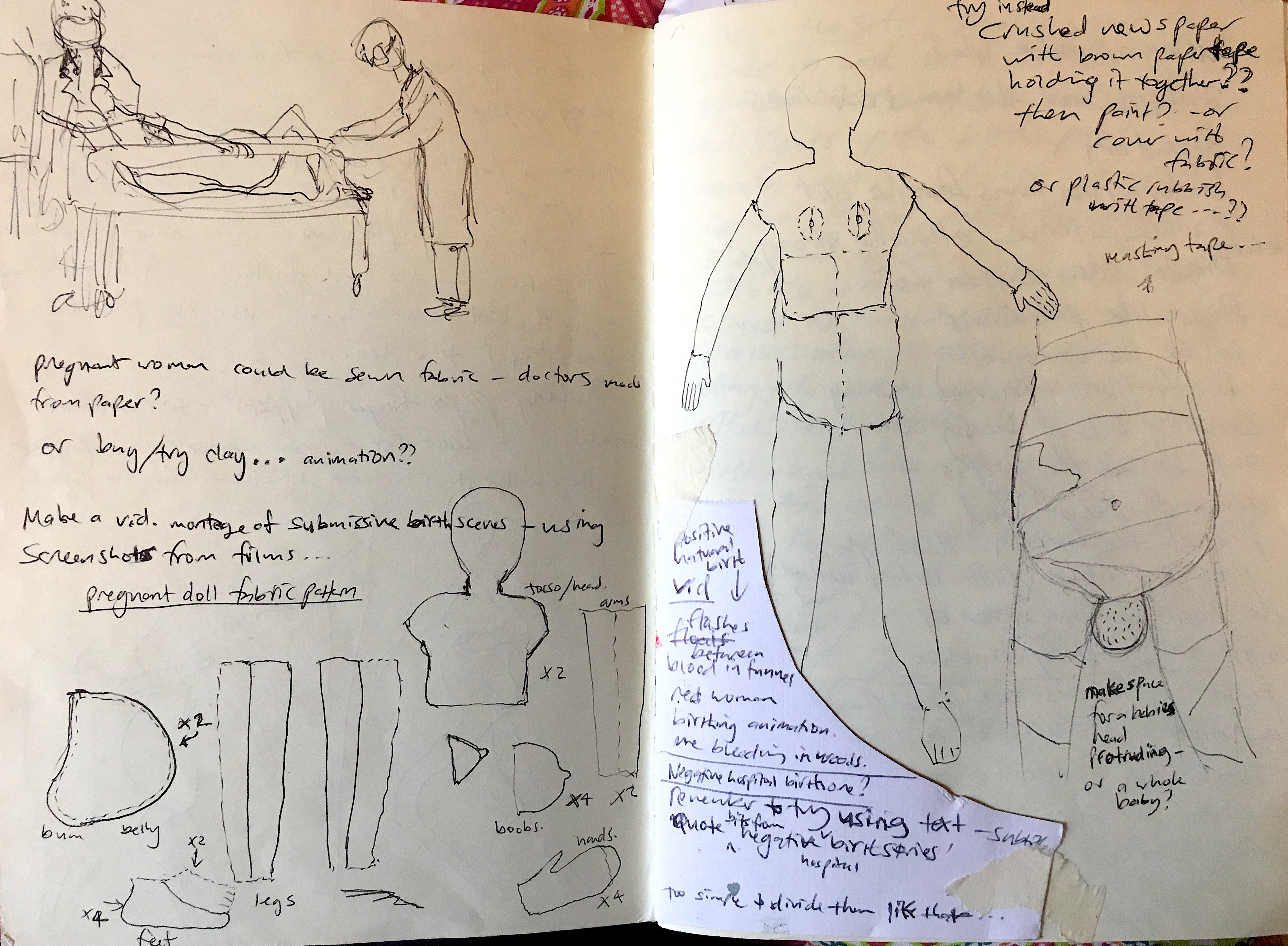 I have now made a hole, like a vagina in an old canvas stretched with pink curtain fabric, and put the painted birthing woman through it. She is giving birth, while being birthed herself. Not sure where I am going with this.