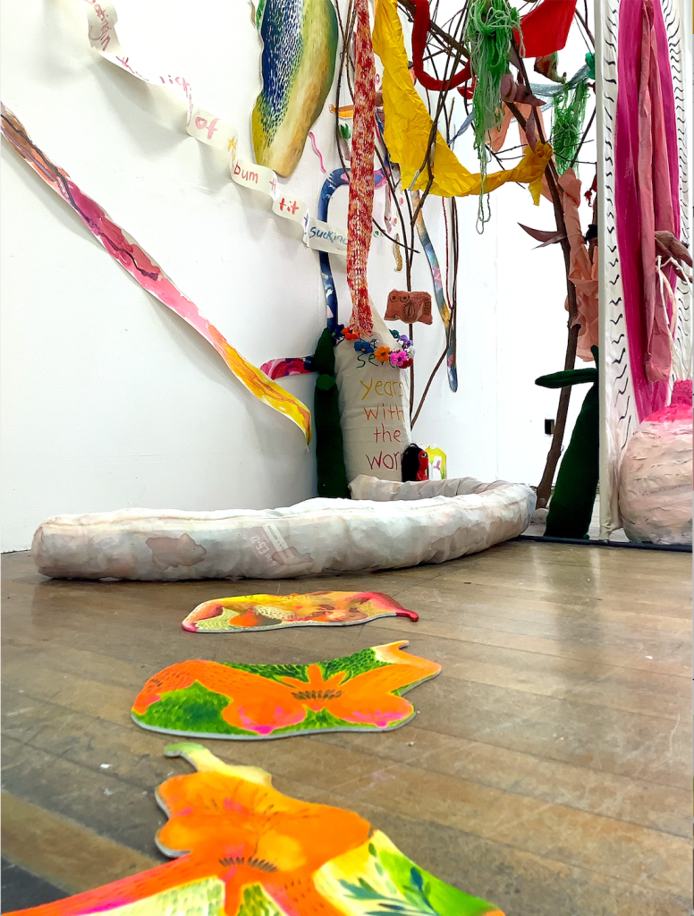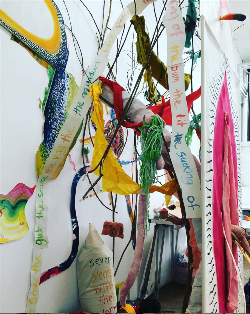 It’s quite gross and in your face. Do I want this? Do I want to shock? It sounds sexual, does that matter? The sculpture is quite in your face and I don’t think shocking or obscene, but more cartoon like and comic, I hope… Someone asked why there were worms (on the wall) if it was about birth…I said it was about composting and decomposing too and, actually I forgot to say bacteria, that’s the link I suppose…bacteria feeding all life.