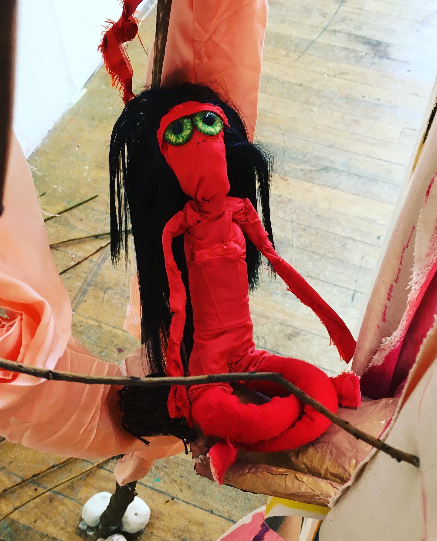 This mostly fits quite well with what I wanted. I made her from scraps of red silk and felt. She is posable, as I used the doll wire Goodie gave me for my birthday, along with the green eyes and black hair she also gave me. I made her a bit like me, skinny, long torso, legs and arms, small breasted and bendy. The eyes are way too big for her face and are only the iris and pupils. I have made them her only features. She is very weird and a bit comic looking, which I like and I have photographed her in and on various parts of the installation.