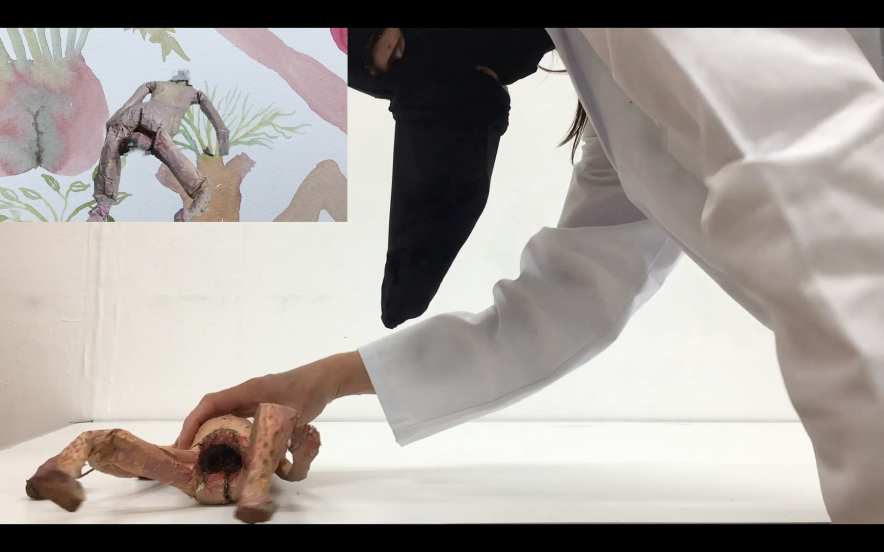 The sound then goes back to being odd and backward and incoherent and the wolf swaggers and displays his work. The footage then changes to the first birth animation I made, before the doll was painted. The active nature birth. The audio becomes gentle, female vocal sounds and bird song and ends. The doll is blank and faceless, disregarded by the patriarchal medical profession, who do not support birth unless it is pathologized. This has led to free-birthing, a movement where woman birth without medical attendants and I am referencing this with the animation at the end.