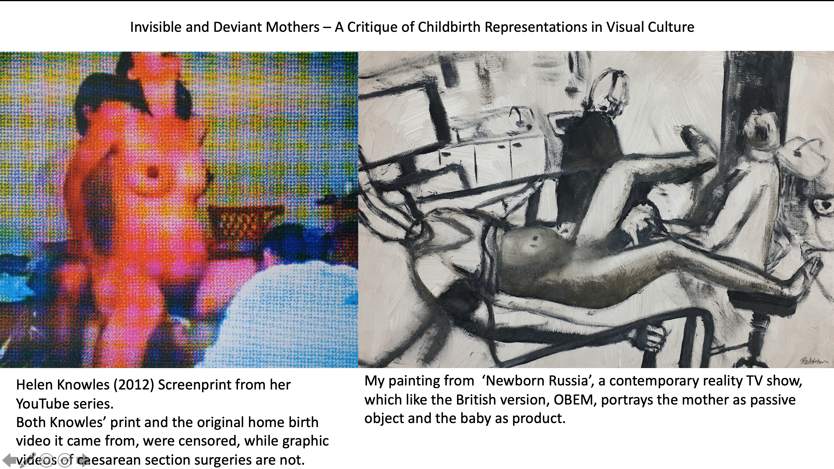 I propose that institution-controlled births predominate in our visual culture and behave as cultural and social propaganda which divides women into two dominant stereotypes – they are characterized within the medical system, as good but invisible, or outside of the medical model, as deviant. I have found that whether it be reality or fiction based, visual art or media, birthing women are seldom shown with any meaningful voice and personal sovereignty and that positive, female-empowered birth images are continually censored. I have first-hand experience of this censorship, as I have twice had very innocent birth themed videos age restricted by YouTube.