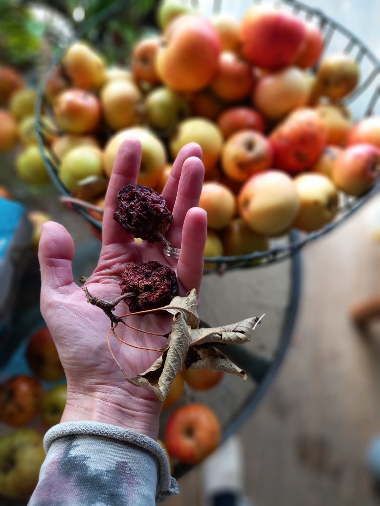 I used to make juice with them when we lived in Fife with mains electricity and could freeze them in batches for three days, then put them under weights in a funnel type contraption I made until the juice came out, and just drink it fresh. Nowadays, Dad and Robin make cider and wine and I sometimes make a lacto-fermented drink/wild soda with them (non alcoholic), or chop them into a jar with a little salt till they go fizzy and eat them as a kind of kimchi. Talking of bacteria…