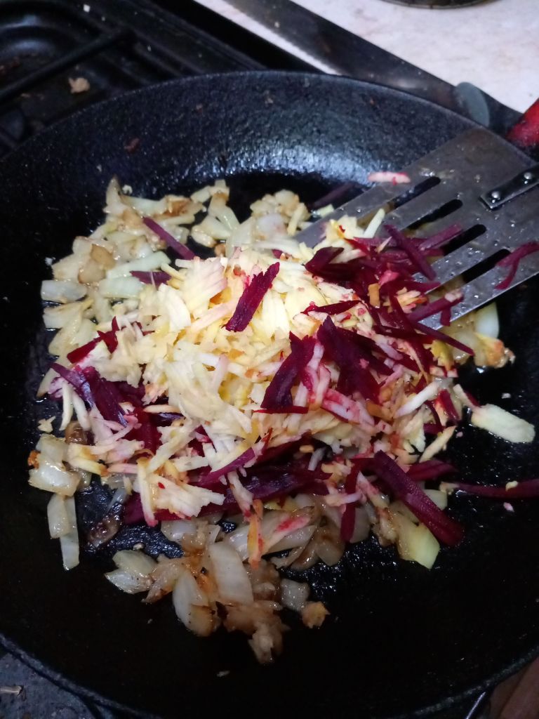 Apple and Beetroot Patties – onion, garlic, grated apple and beetroot, carraway seeds, a little chopped kale, dried oregano, nettles or any herbs, breadcrumbs, salt, black pepper, an egg and or milk if you want and maybe cheese. Mix, form into patties/burgers or one big thick or thin pancake and fry. Can be made vegan with obvious adaptions, and I reckon any ingredient can be replaced with any other, within reason. I’m afraid I won’t be giving quantities or cooking times because I’ve no idea, and I’d just be making it up if I did. More detail below, 11 paragraphs down.