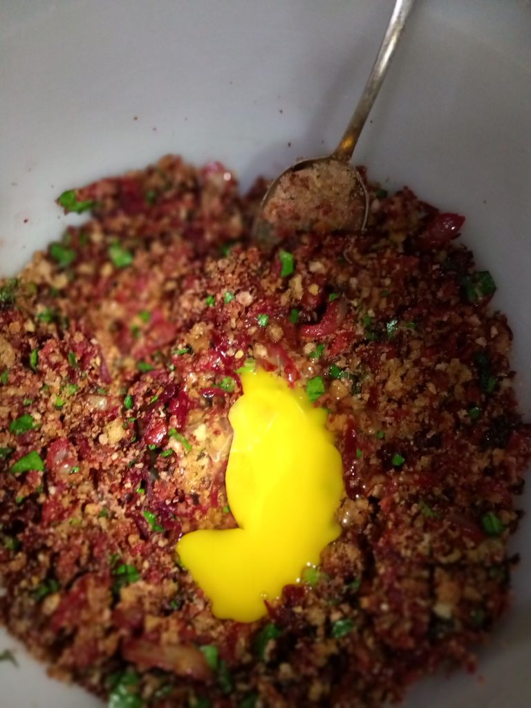 So, anyway, I fried the onion and garlic, added grated apple and beetroot into the pan, cumin or carraway seeds, a little chopped kale and dried oregano – I have managed to dry three jars worth for the first time ever (I always have enough, but never remember to pick enough before it gets past its best). I added the dried stuff to the bowl of breadcrumbs with some black pepper, oh and some dried nettles (I’ve dried loads of them too this year for tea and as a dried vegetable) and one of our good eggs. I also had some old milk that was smelling a bit sharp, so I added that too. I couldn’t really get the mix to hold together though, probably another egg would have helped but I am saving our eggs for our traditional Christmas Holiday Vegetable Salad, so (our eldest, who will be home for Christmas, will eat it – vegan, but will eat our eggs only). I tried adding a little flour, but it was getting late, so I just threw lumps in the frying pan, with plenty of oil, and bashed them flat with the fish slice. (I switch back and forth between olive oil, which is supposedly the healthiest to heat, and cold pressed rapeseed oil, which is local and cheaper).