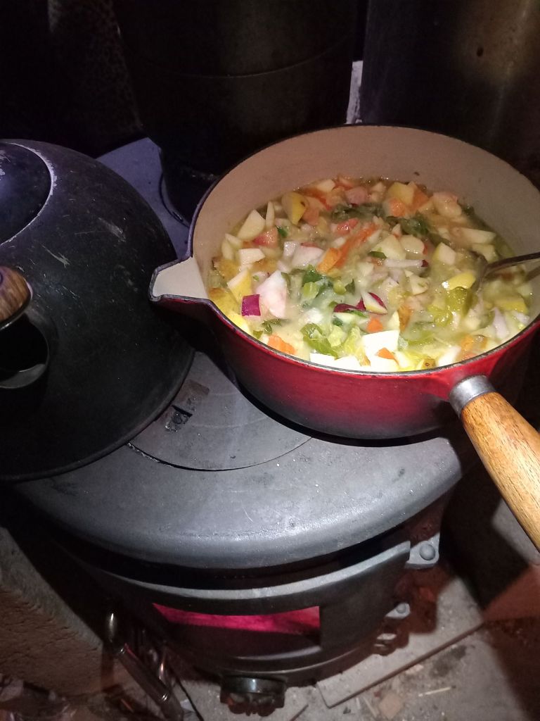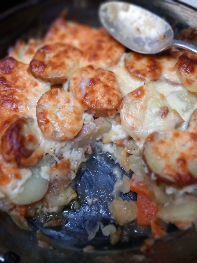 But to save us from a third night of this soup Charlie said he could layer the apple, fried with onion and garlic and maybe carrot, under sliced potato and top it with grated cheese. I said maybe make a white sauce, or it might be a bit dry (the old dry/wet taste differences again). So, he made one with oat milk because we had some to use up. He boiled the potatoes, and diced carrots, first, so nothing really needed cooked once it went in the oven. This was just to consolidate it and melt the cheese I suppose? I don’t really know the cookie language. Anyway, it was great, and we had it with boiled kale on the side.