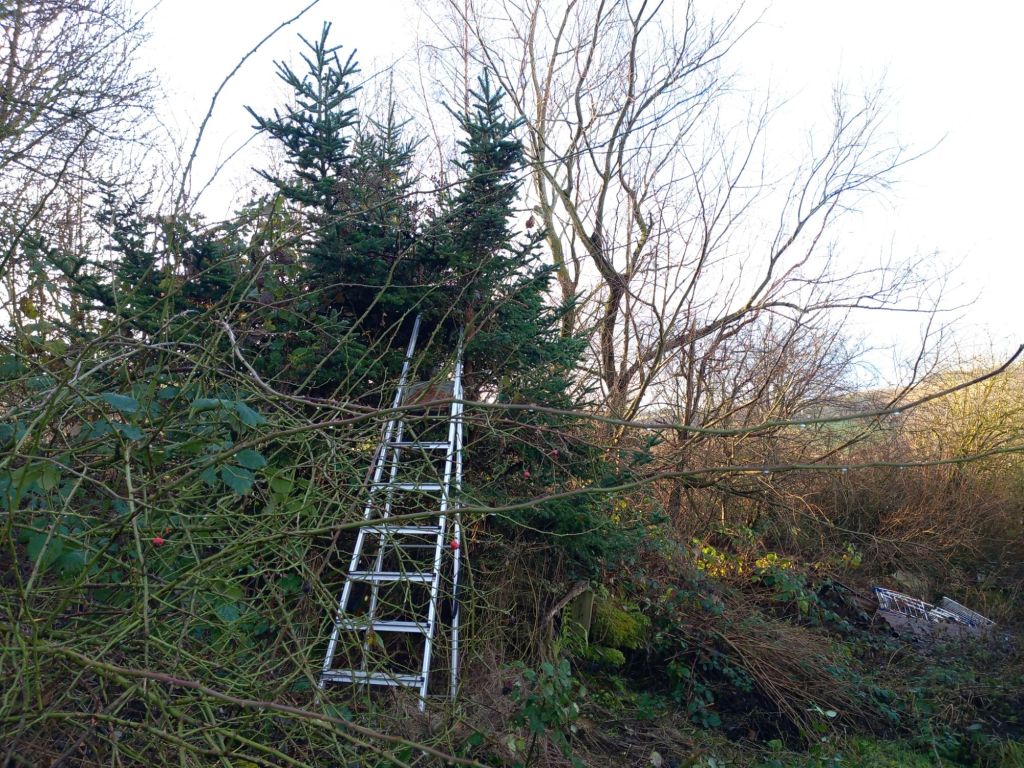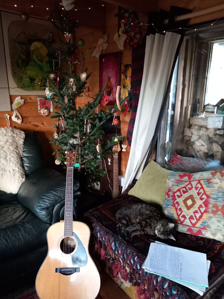 Here is a bit about Christmas trees. Being a peace and earth loving hippy, I can’t really condone cutting down Christmas trees, nor plastic trees, but buying pot grown trees is one solution, or cutting a branch from a big living tree is another cheaper option, though I know obviously not everyone has access to trees. We used to know people who celebrated solstice instead of Christmas and who cut a small, leafless winter branch and decorated it. I liked this idea, but my kids were already hooked on the evergreen thing by then. Since we’ve been here at Coldhome, we have for years cut a branch from the fallen but still living Lodge Pole Pines, which grow by the roadside at the top of our track. But several years back, on two consecutive yers when we must have been feeling a bit flush, we also bought a pot grown tree for a local garden centre and then I planted them out, outside. They were the traditional Christmas tree variety, Norwegian Spruces, I think, and they shot up fast. they are not really rhe sort of trees you coppice, but I couldn’t let them get too big where they are, on the south west of our house, so I cut the top off one to use as our tree one year. The poor tree in the ground didn’t seem to suffer but didn’t look very pretty initially, but two new Christmas tree shaped tops grew in it’s place and it was restored to a proper shape. I cut the top off the other one another year, and the same thing happened. This year, I cut one of the two tops from one, and the tree in the ground still looks fine because it has a second top. Quite a good system, really. I may have an endless supply now.