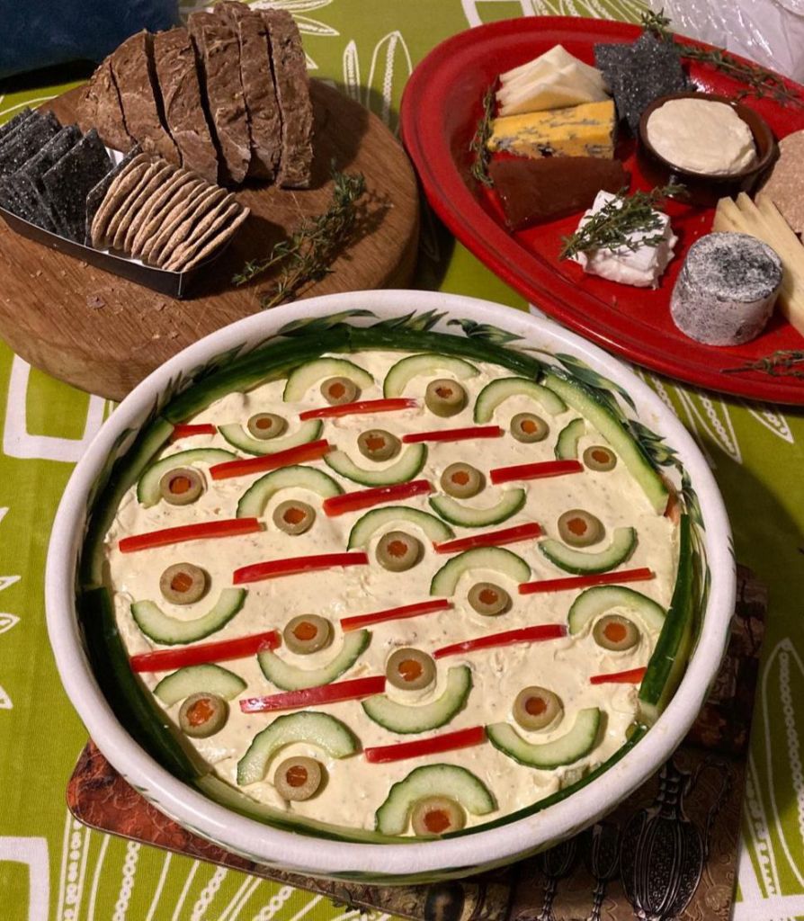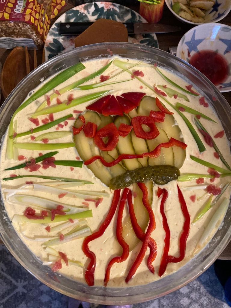 For the mayo, put the 3 egg yolks in a blender with some lemon juice and mustard, and then you blend and gradually add olive oil till it thickens. Mine breaks every single year, god knows why, but I try not to care. You spread it on top of the flattened salad, and then you can decorate the surface with any colourful vegetables you like to make a pattern or scene if you are so inclined. Peppers and stuffed olives are particularly good. I never seem to have time or energy for this part. The kids or my sister Anna used to do it, but traditions are slipping. Anyway, it lasts all through Christmas if you make enough and makes a great lunch on its own, with crackers and cheese, or a starter for the main meal if you prefer.